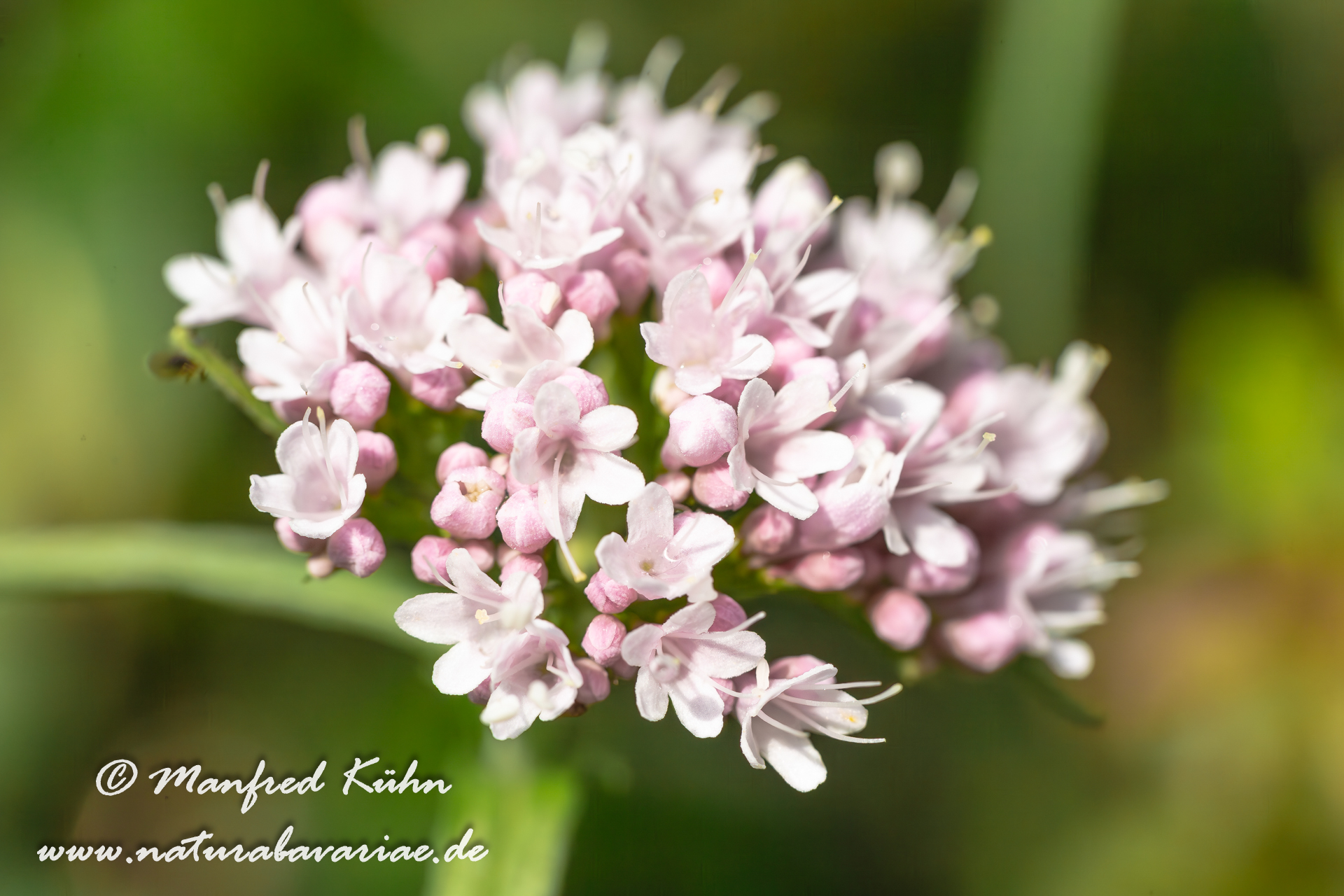 Valerian (Valeriana officinalis, Caprifoliaceae) is a perennial flowering plant, with heads of sweetly scented pink or white flowers that bloom in the summer, Bavaria, Germany |Echter Baldrian (Valeriana officinalis), Valerian, ätherisches Öl (neben Valerensäure unter anderem auch die Isovaleriansäure, die für den unangenehmen Geruch des Wurzelstocks verantwortlich ist), Valepotriate und Alkaloide, Bayern
