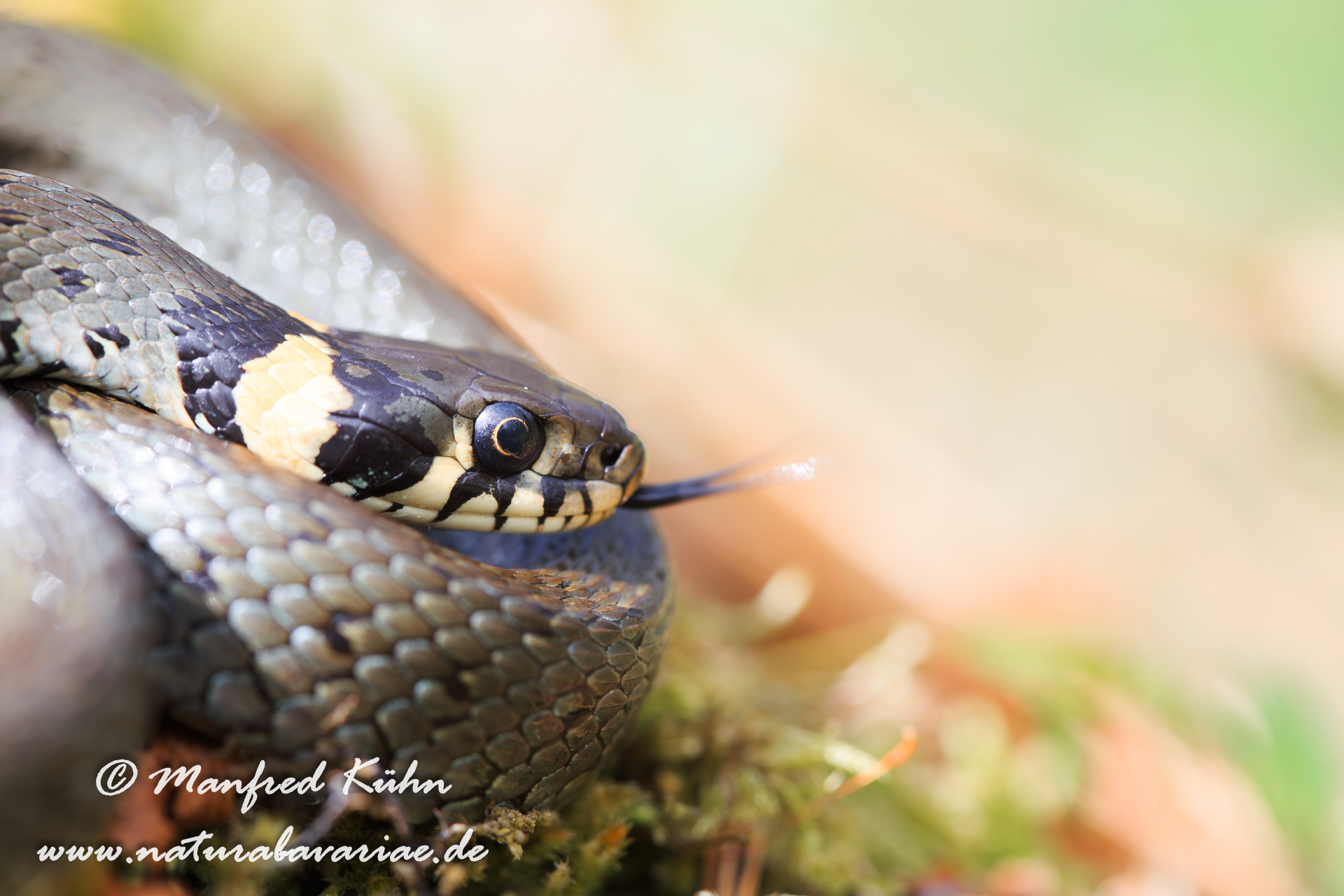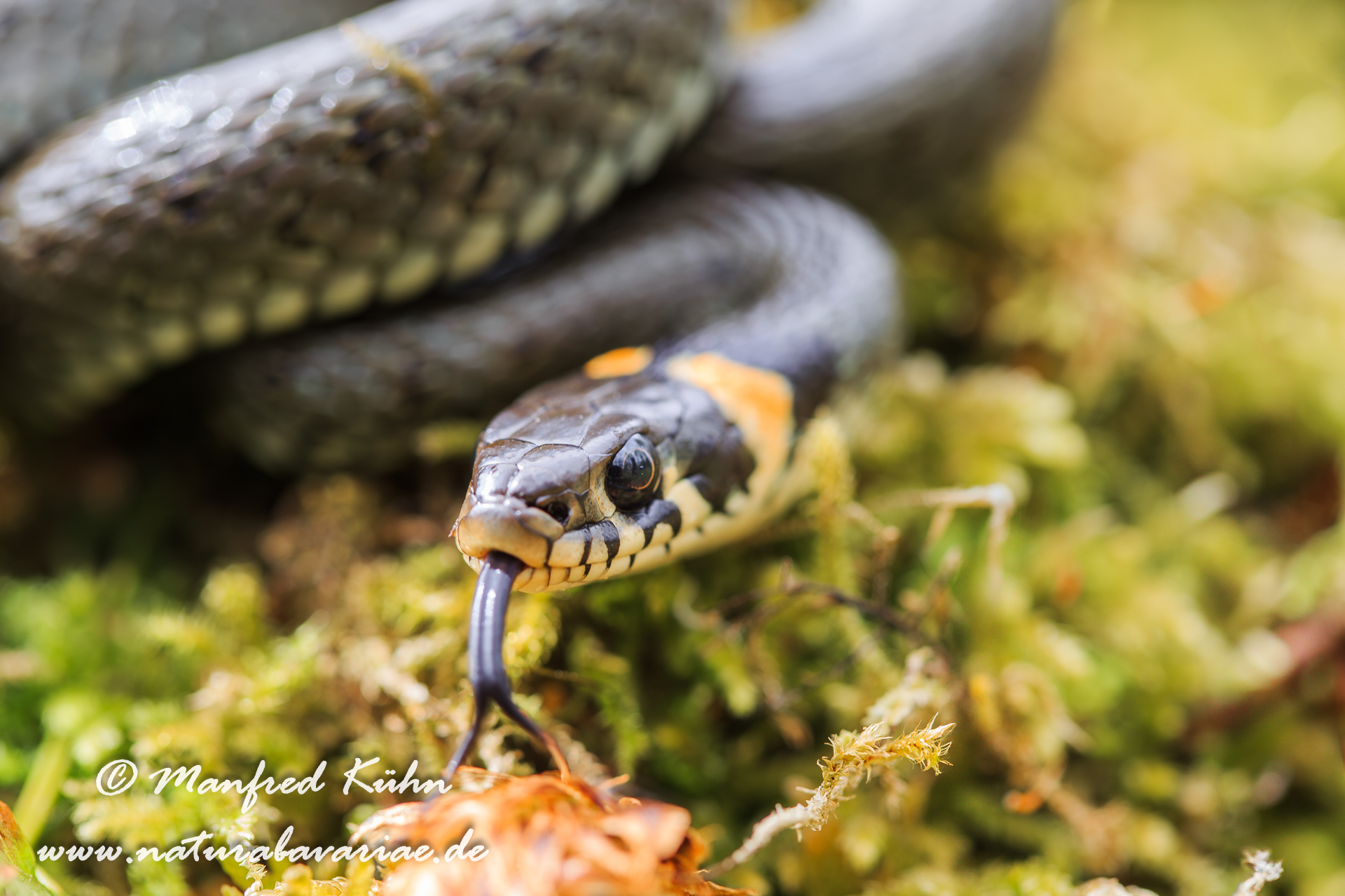 grass snake (Natrix natrix), sometimes called the ringed snake or water snake, Bavaria, Germany |Die Ringelnatter (Natrix natrix) ist eine zur Familie der Nattern (Colubridae) gehörende Schlangenart, Bayern, Deutschland