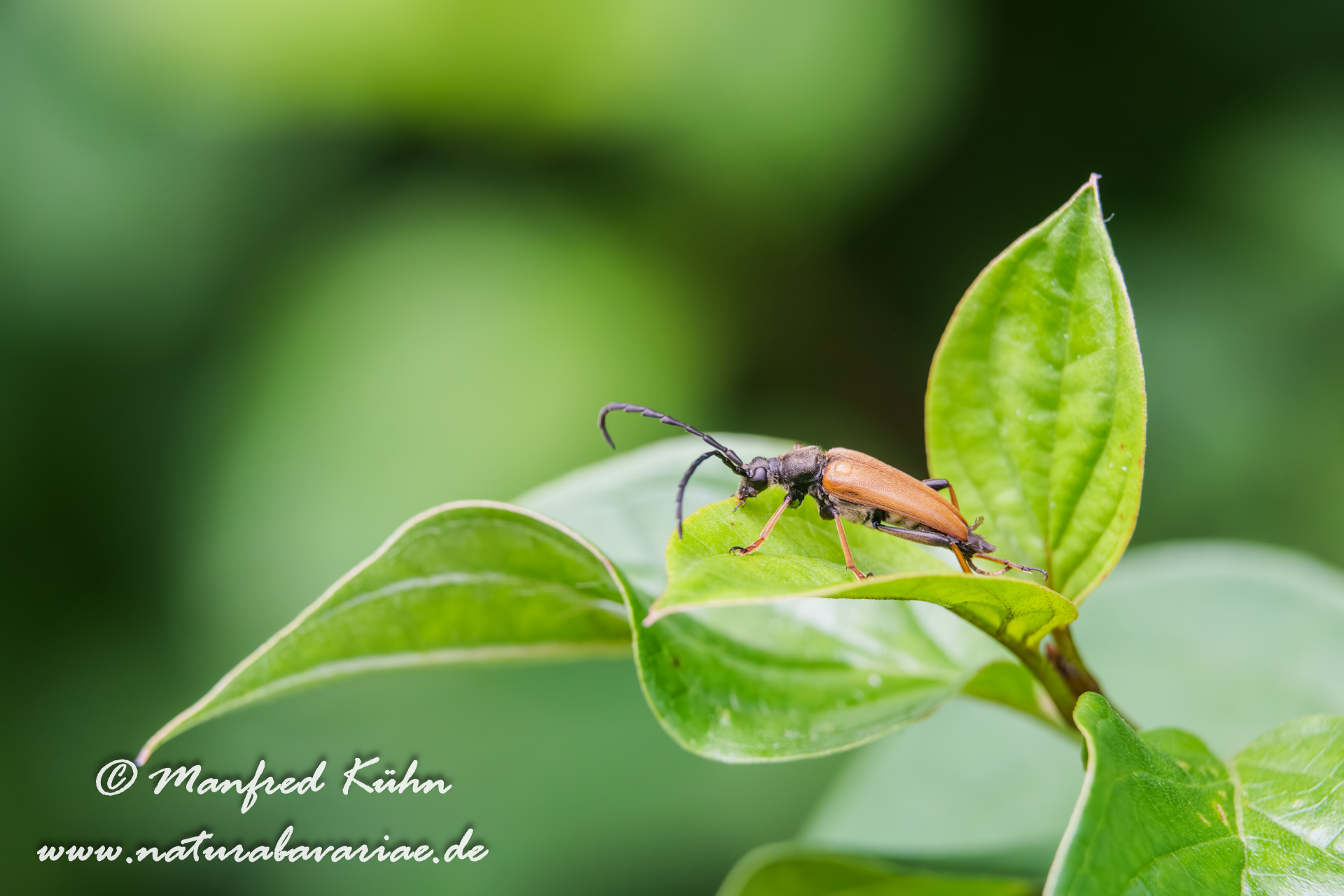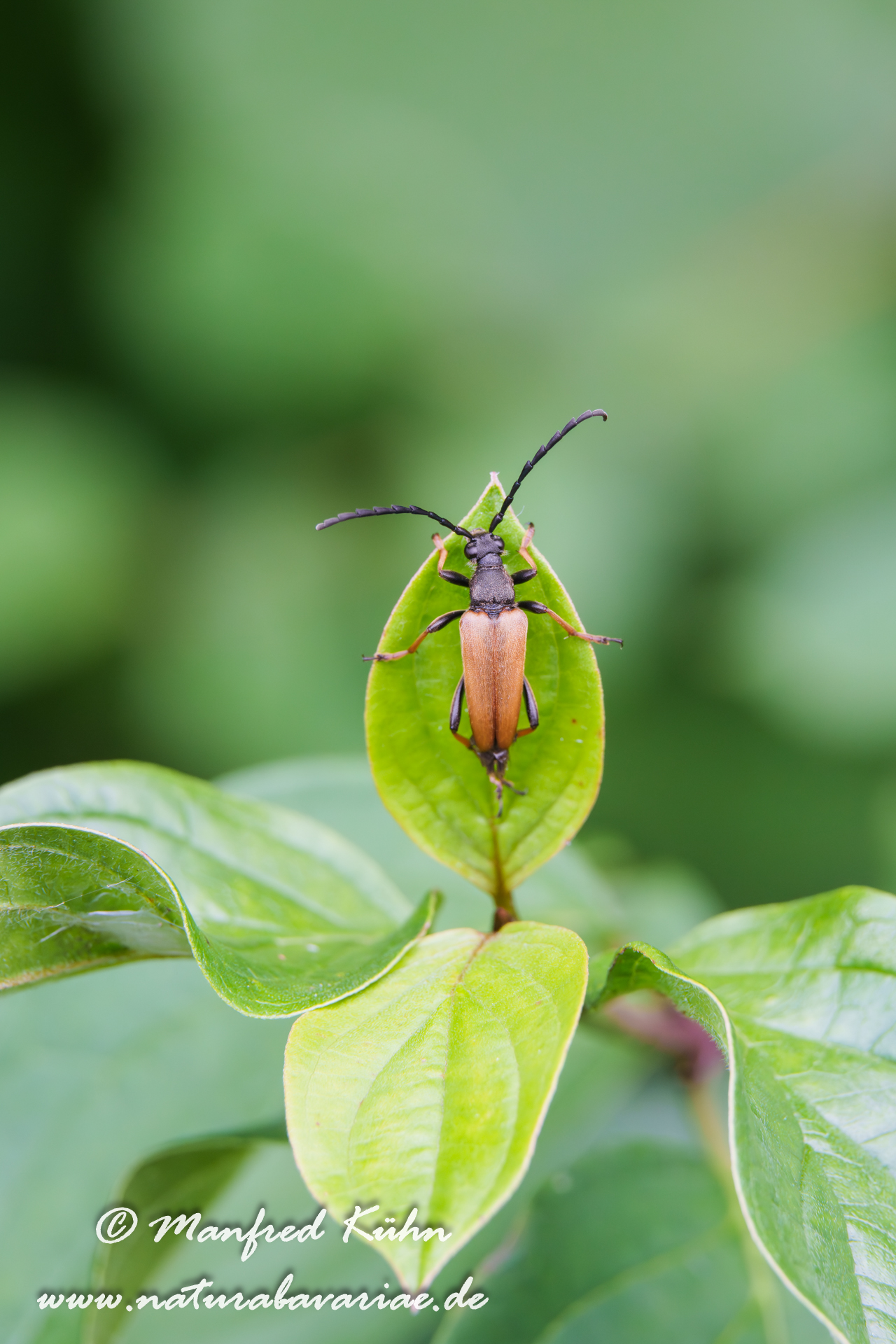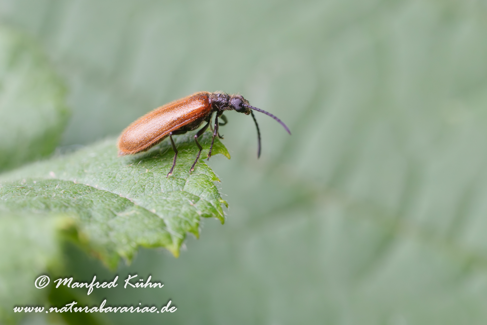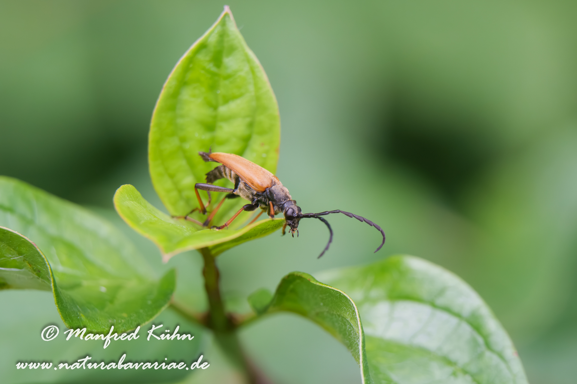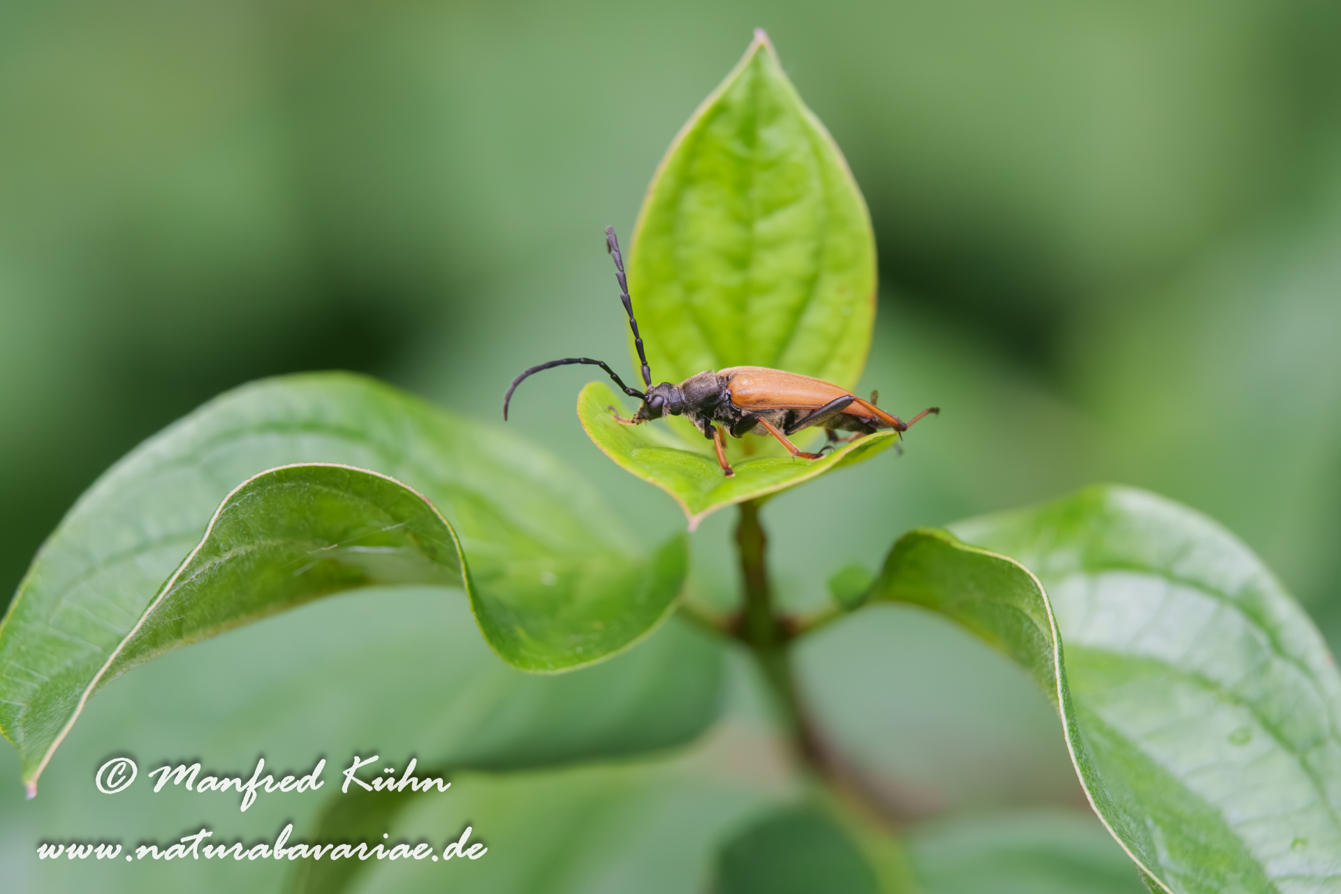 The red-brown longhorn beetle, is a species of beetles belonging to the family Cerambycidae. |Der Rothalsbock (Stictoleptura rubra, Syn.: Leptura rubra, Corymbia rubra, Aredolpona rubra), Männchen, auch Roter Halsbock oder Gemeiner Bockkäfer genannt, gehört zur Familie der Bockkäfer (Cerambycidae) und dort zur Unterfamilie der Schmalböcke (Lepturinae), Bayern