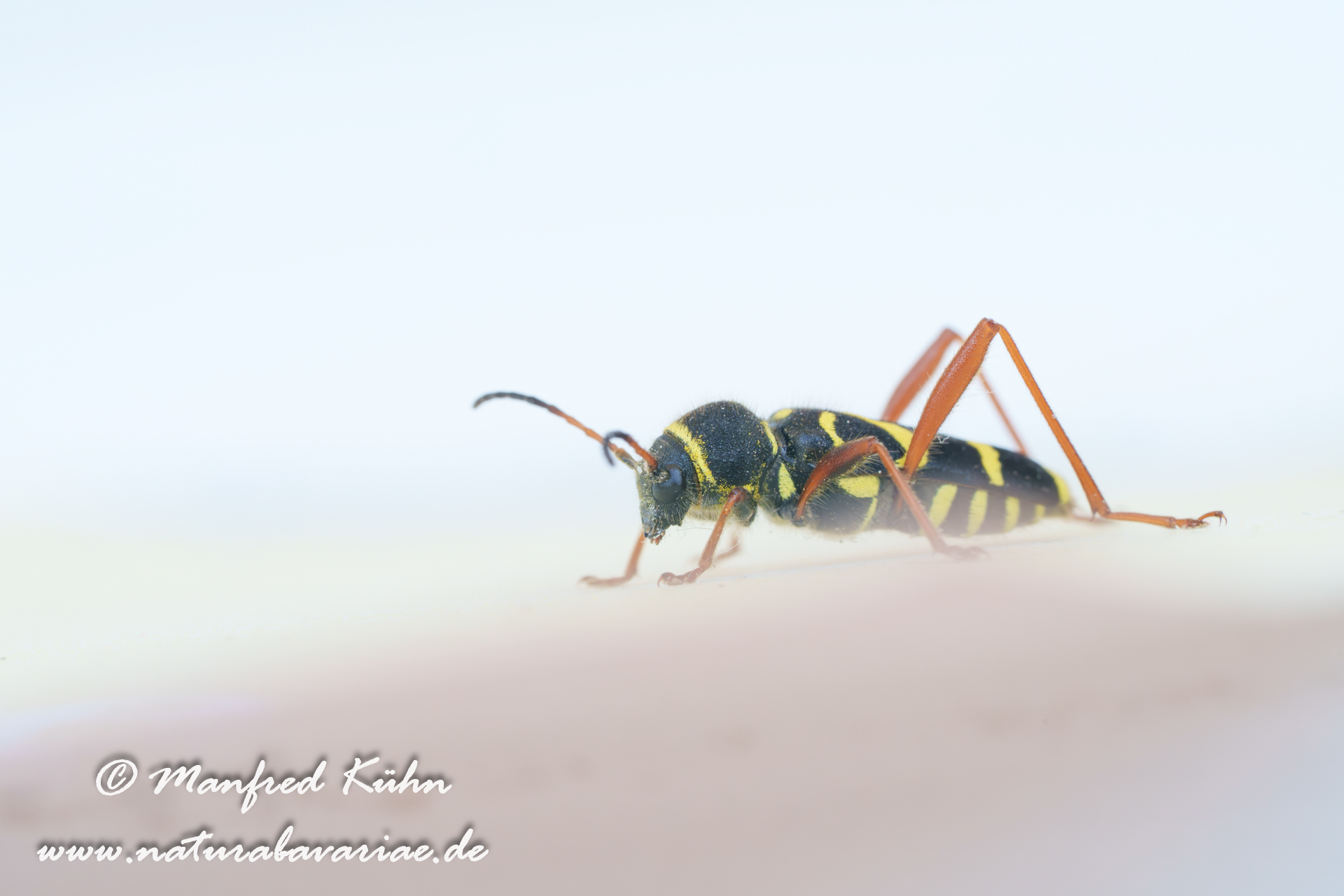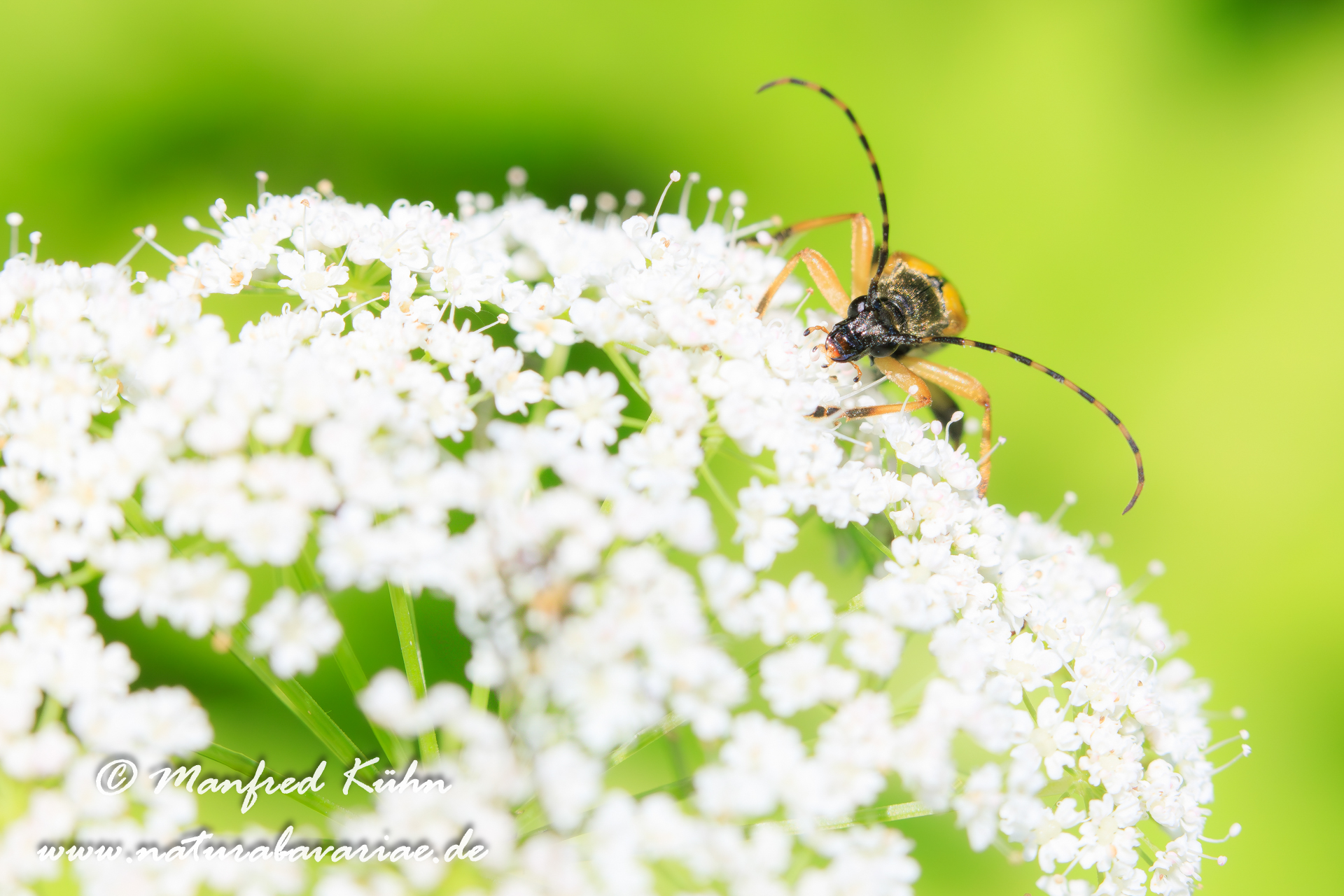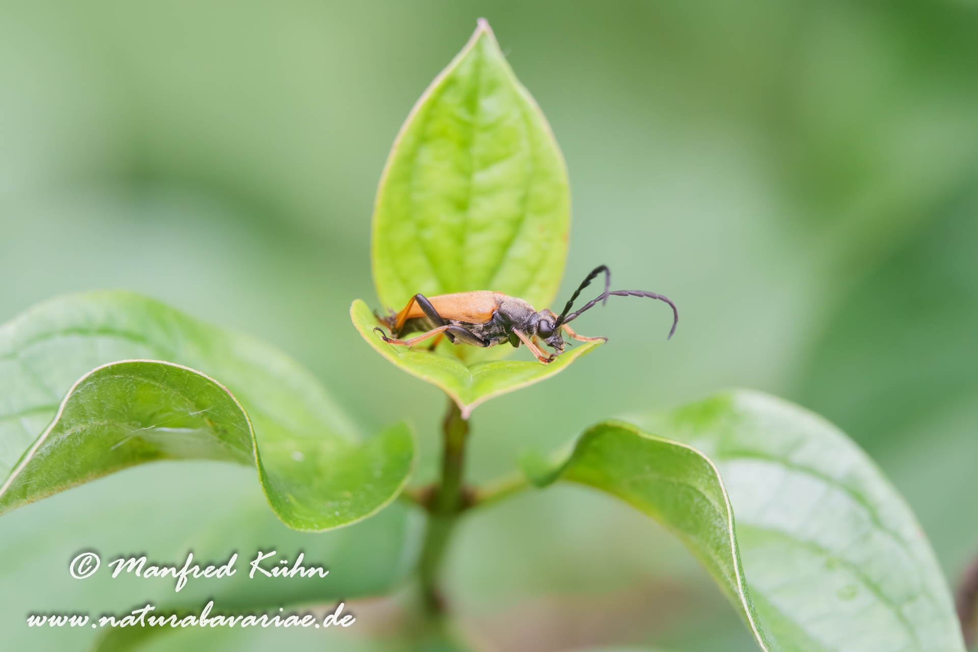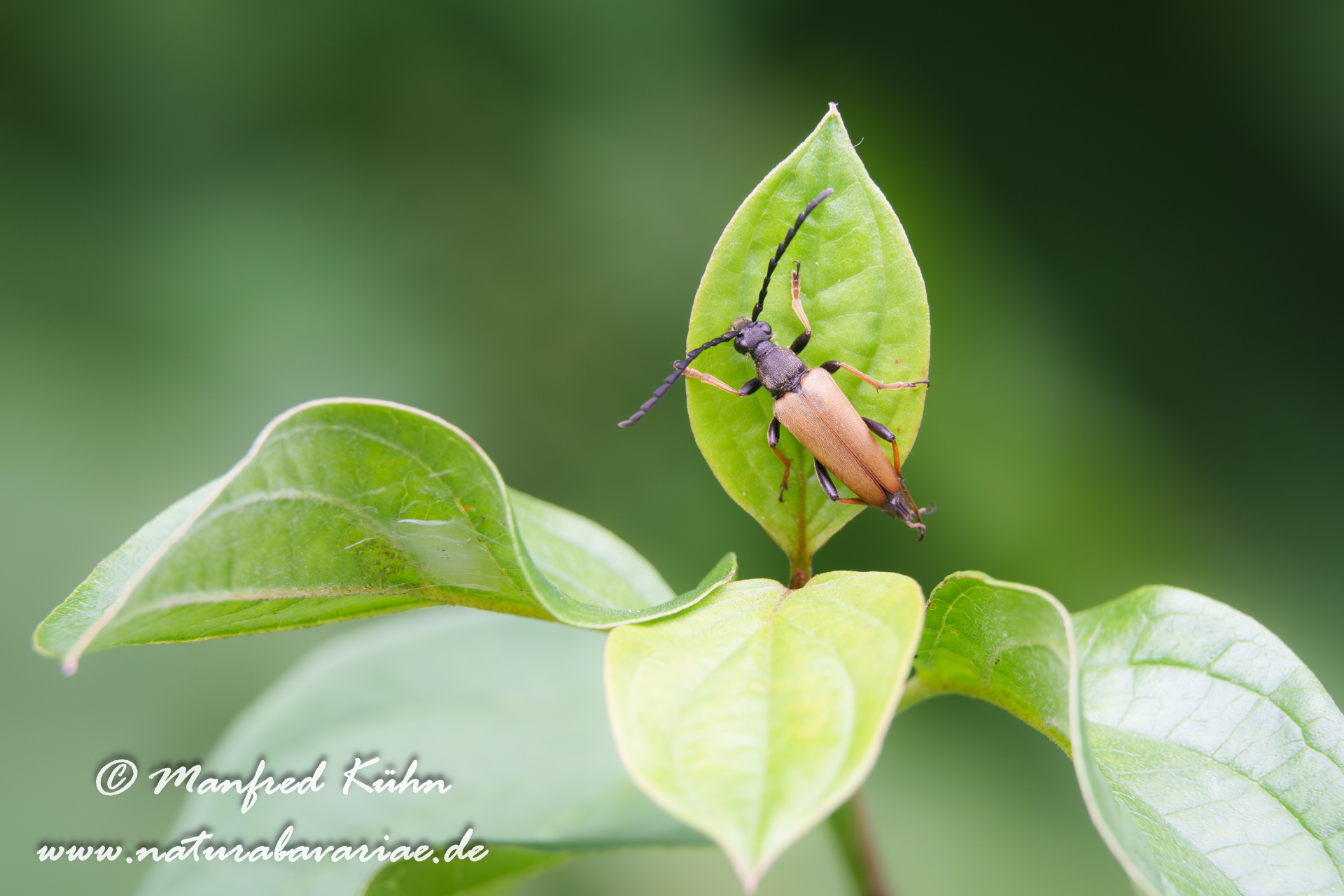 The red-brown longhorn beetle, is a species of beetles belonging to the family Cerambycidae. |Der Rothalsbock (Stictoleptura rubra, Syn.: Leptura rubra, Corymbia rubra, Aredolpona rubra), Männchen, auch Roter Halsbock oder Gemeiner Bockkäfer genannt, gehört zur Familie der Bockkäfer (Cerambycidae) und dort zur Unterfamilie der Schmalböcke (Lepturinae), Bayern