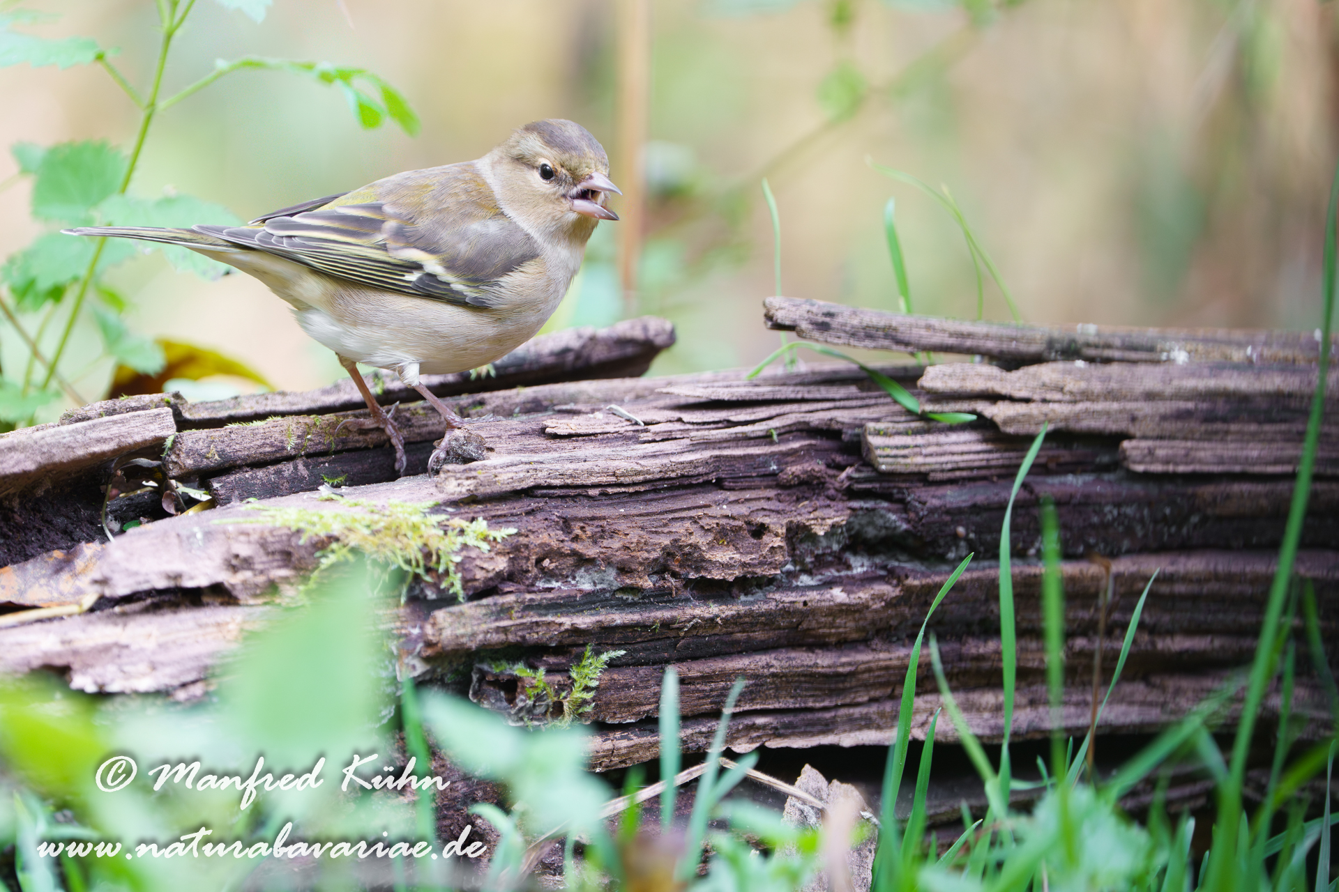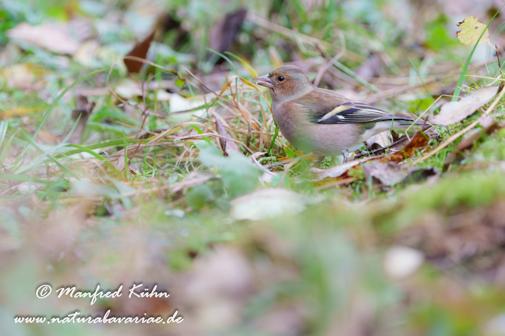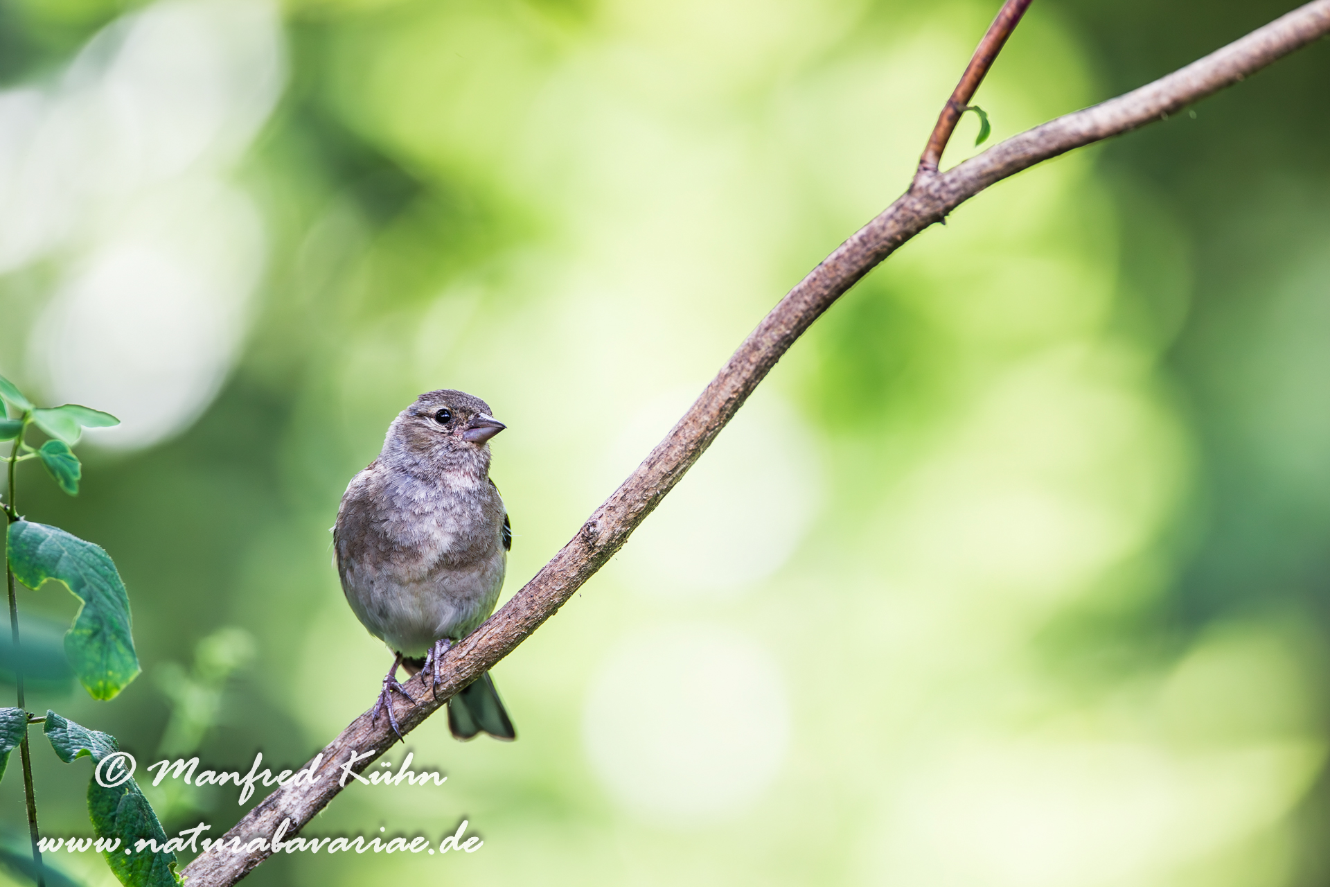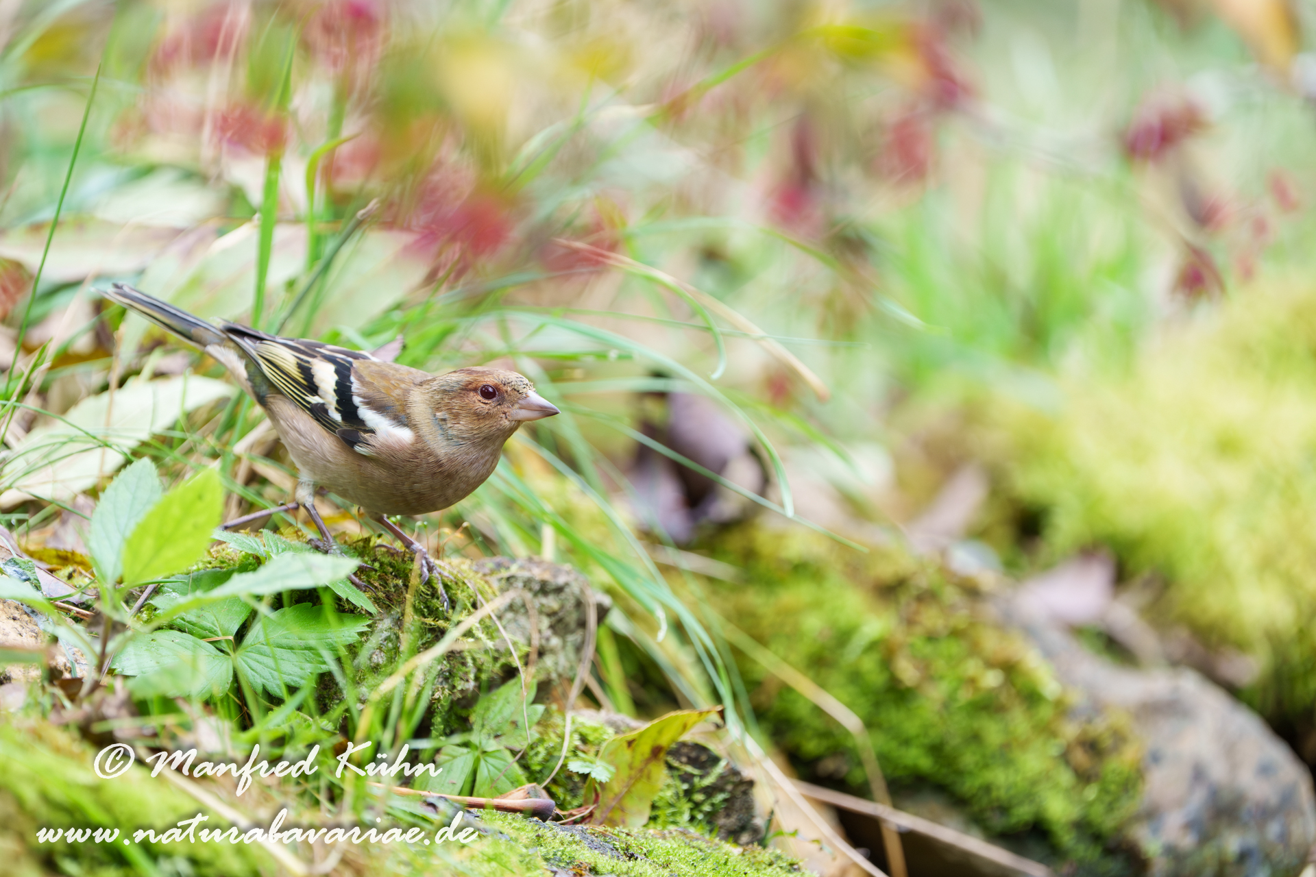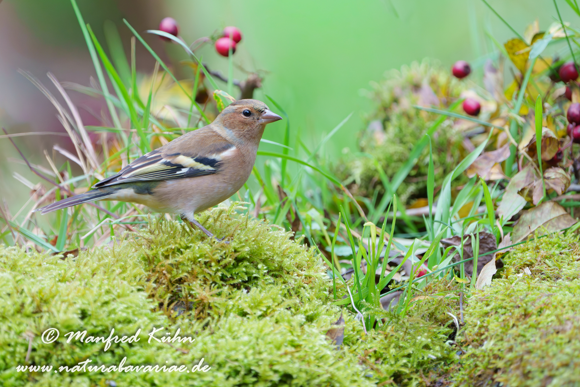 The common chaffinch (Fringilla coelebs), usually known simply as the chaffinch, is a common and widespread small passerine bird in the finch family, female, Bavaria |Der Buchfink (Fringilla coelebs) ist ein zur Familie der Finken (Fringillidae) gehöriger Singvogel, Weibchen, Bayern,