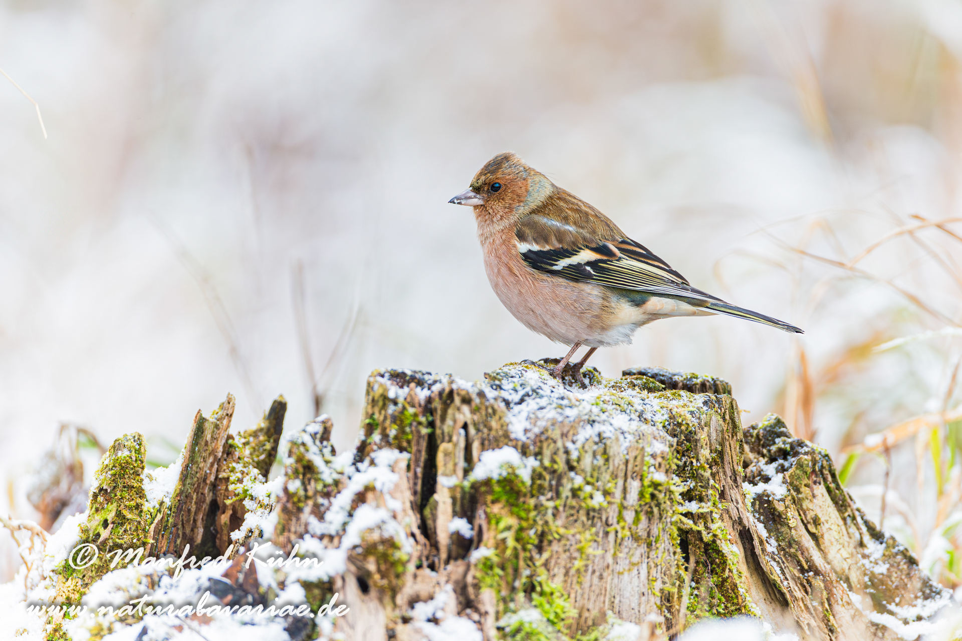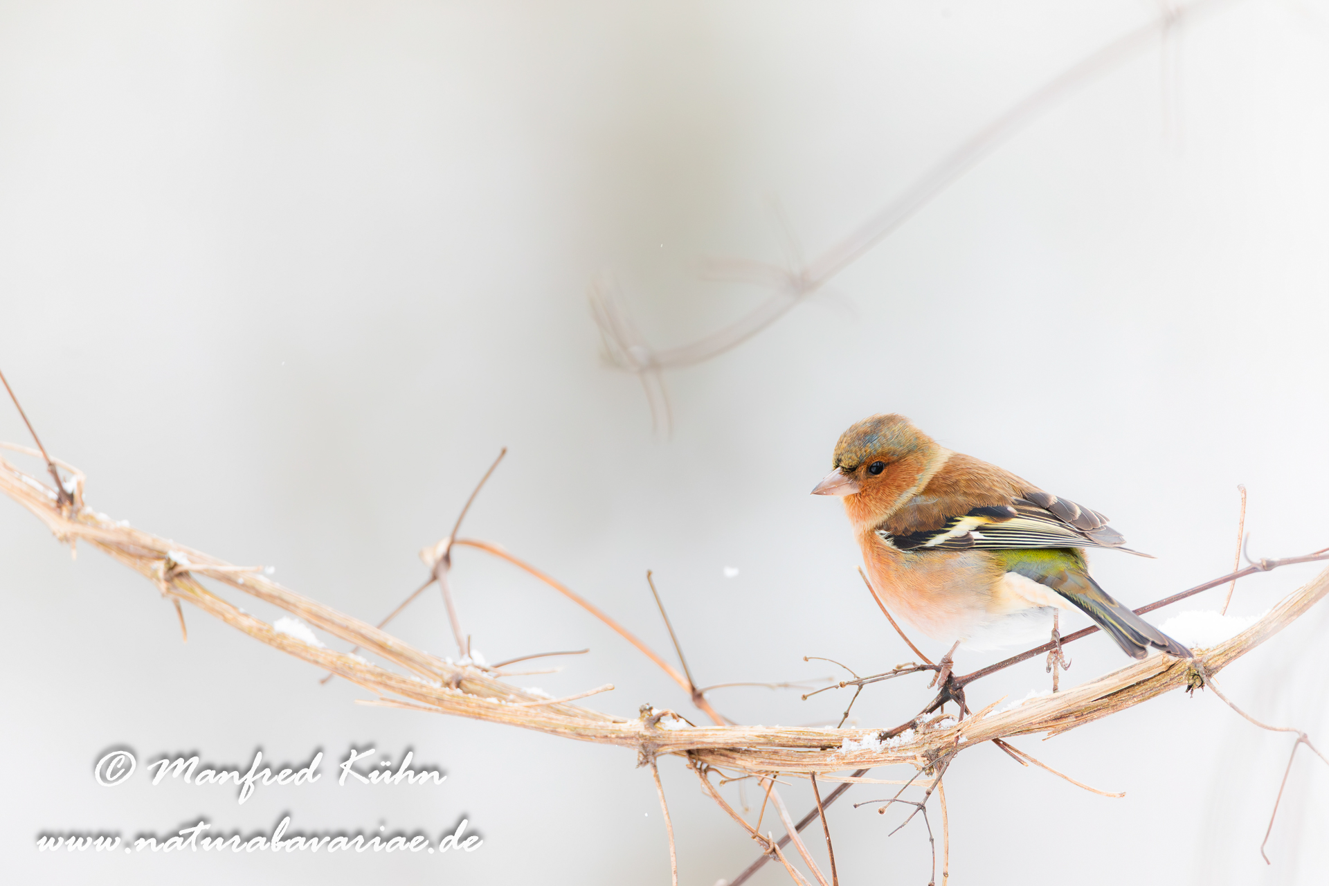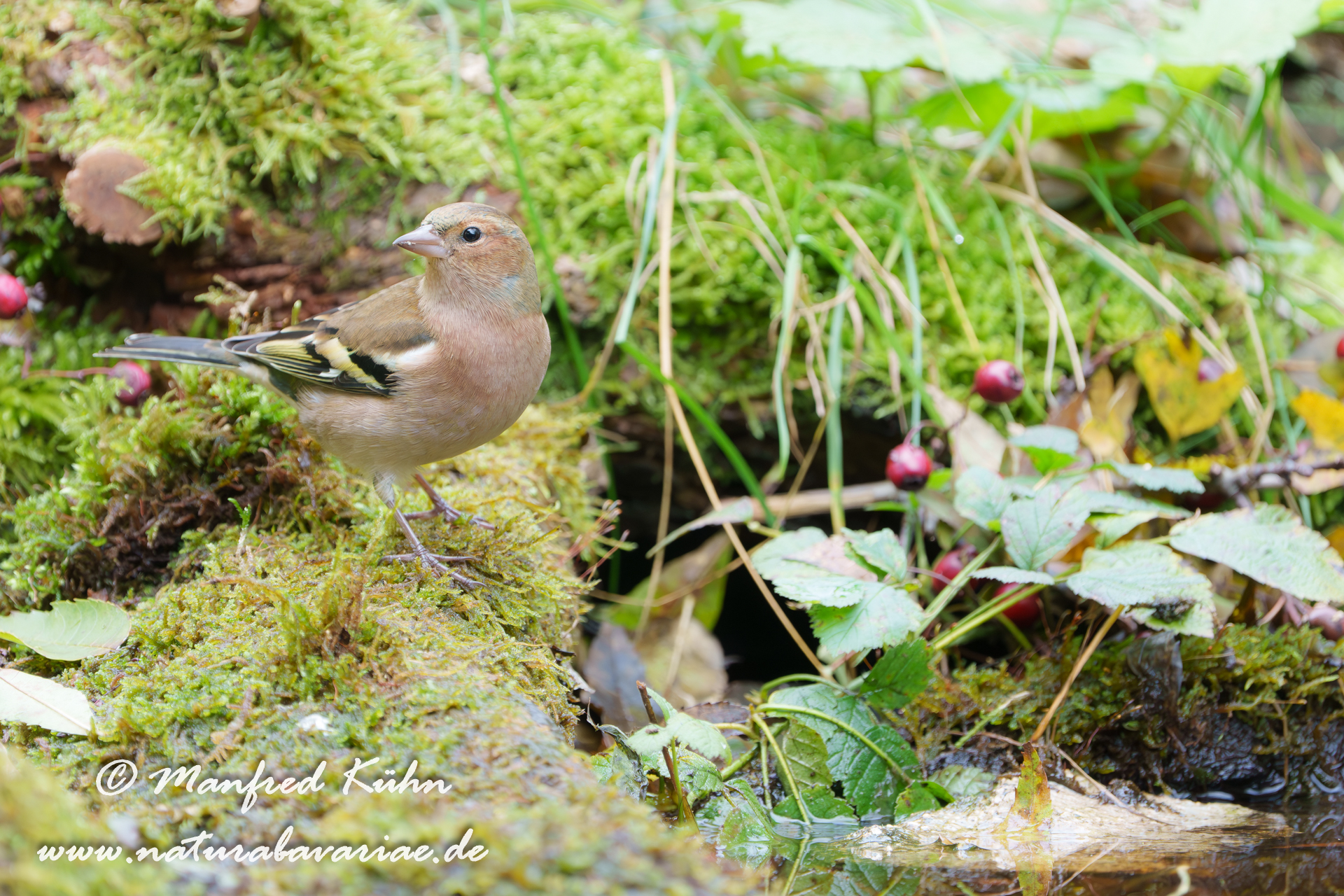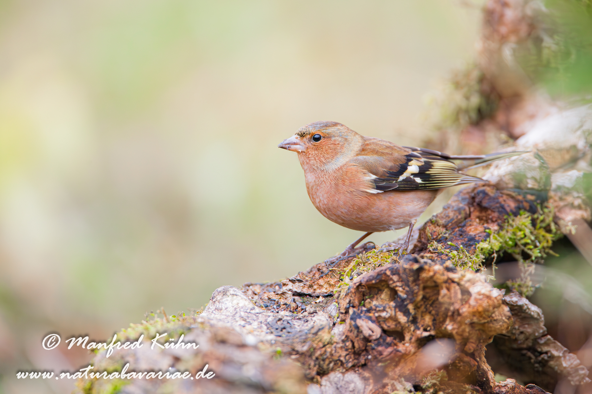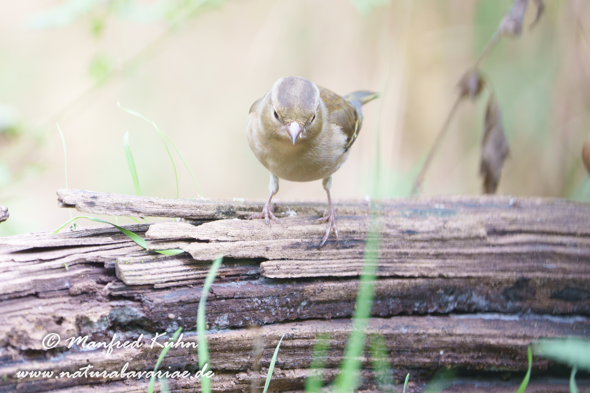 The common chaffinch (Fringilla coelebs), usually known simply as the chaffinch, is a common and widespread small passerine bird in the finch family, female, Bavaria |Der Buchfink (Fringilla coelebs) ist ein zur Familie der Finken (Fringillidae) gehöriger Singvogel, Weibchen, Bayern,