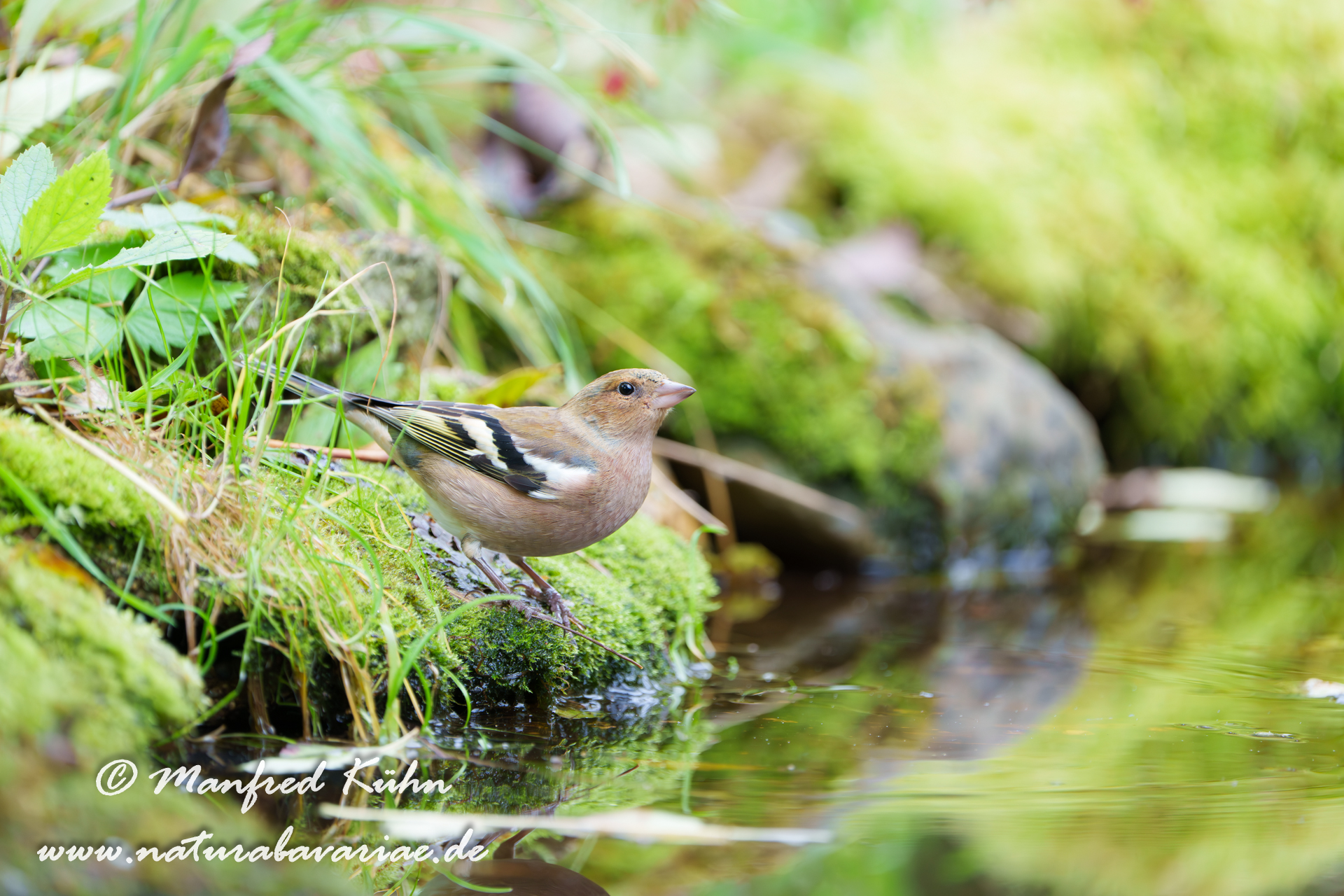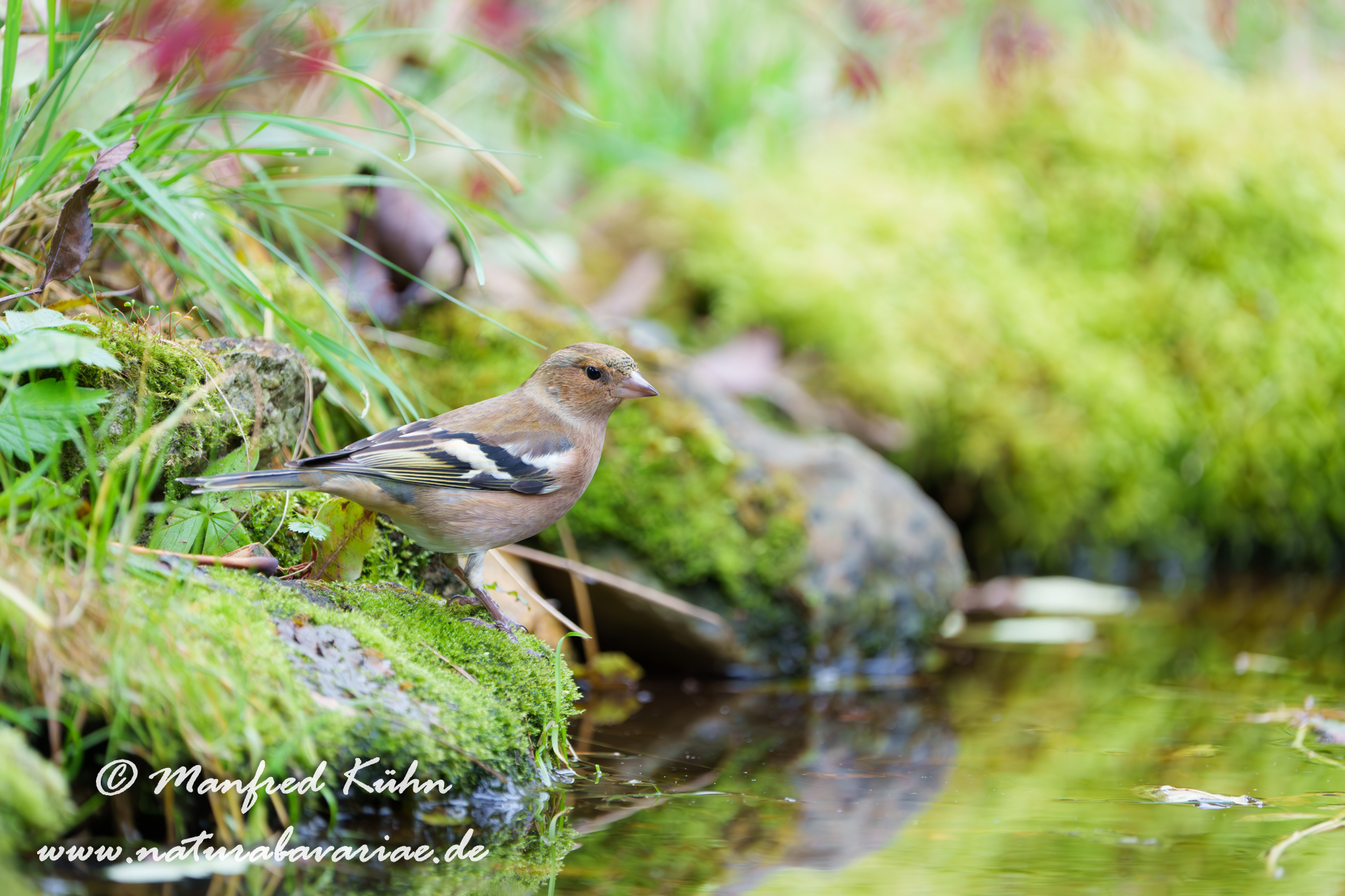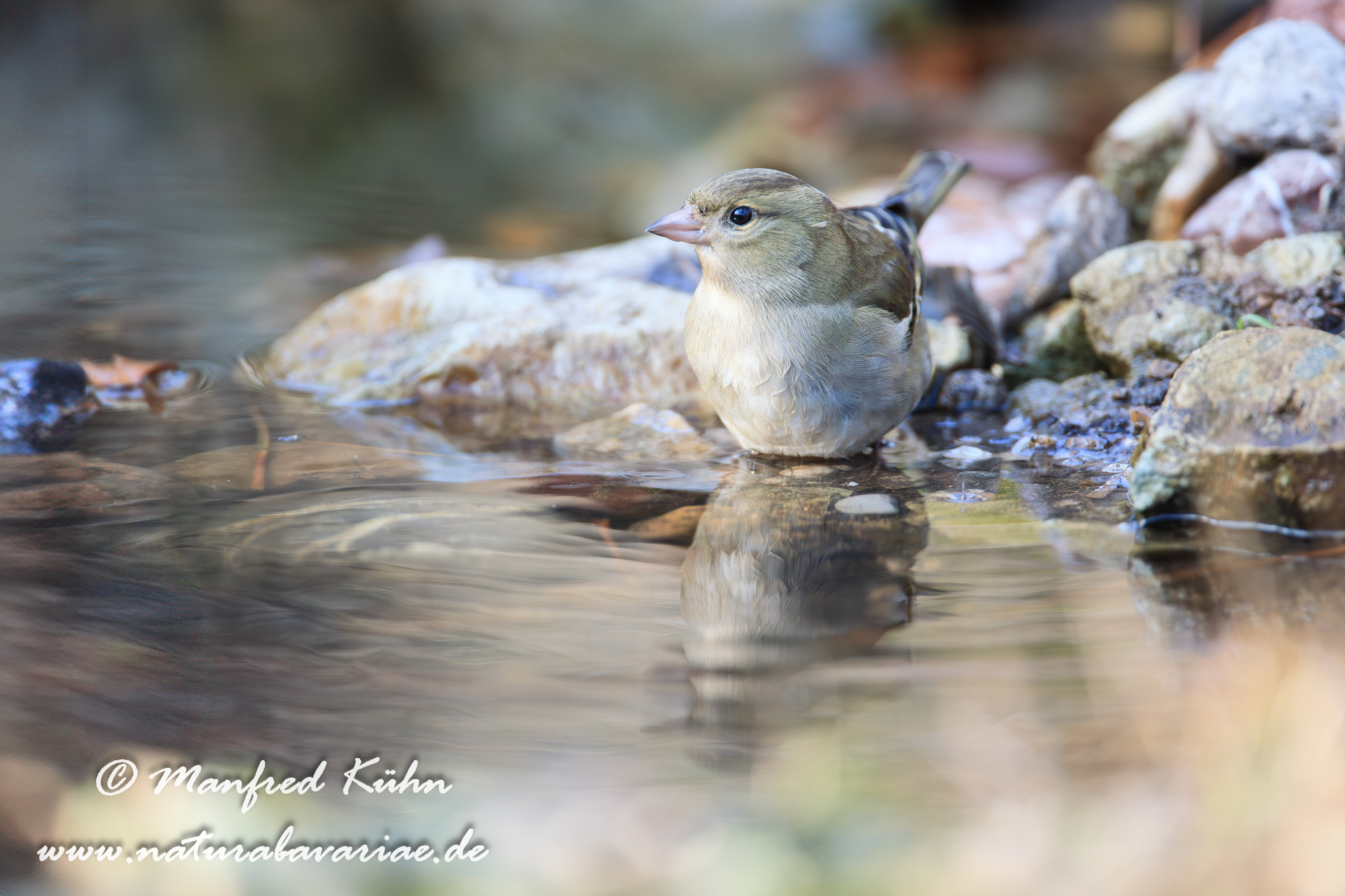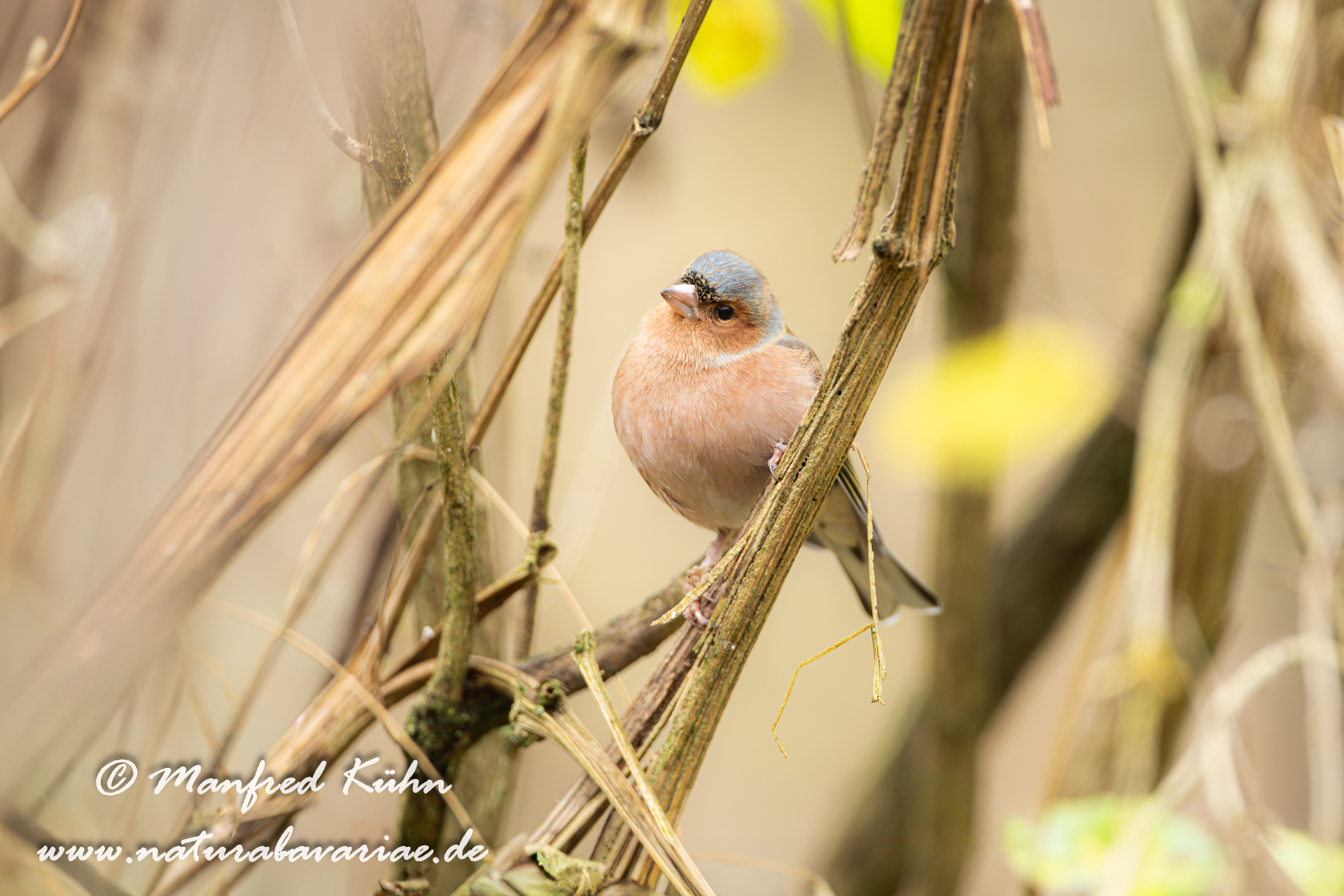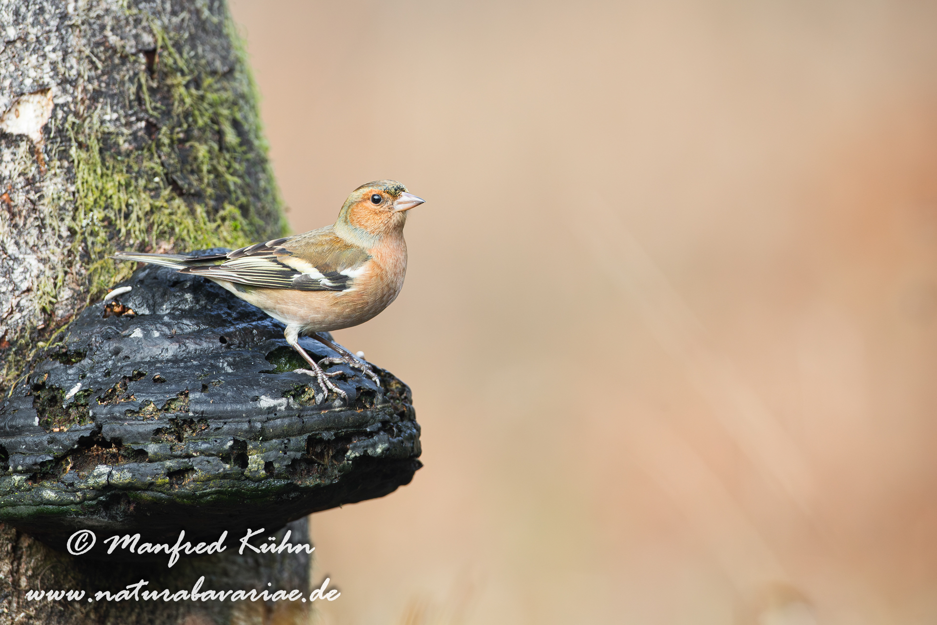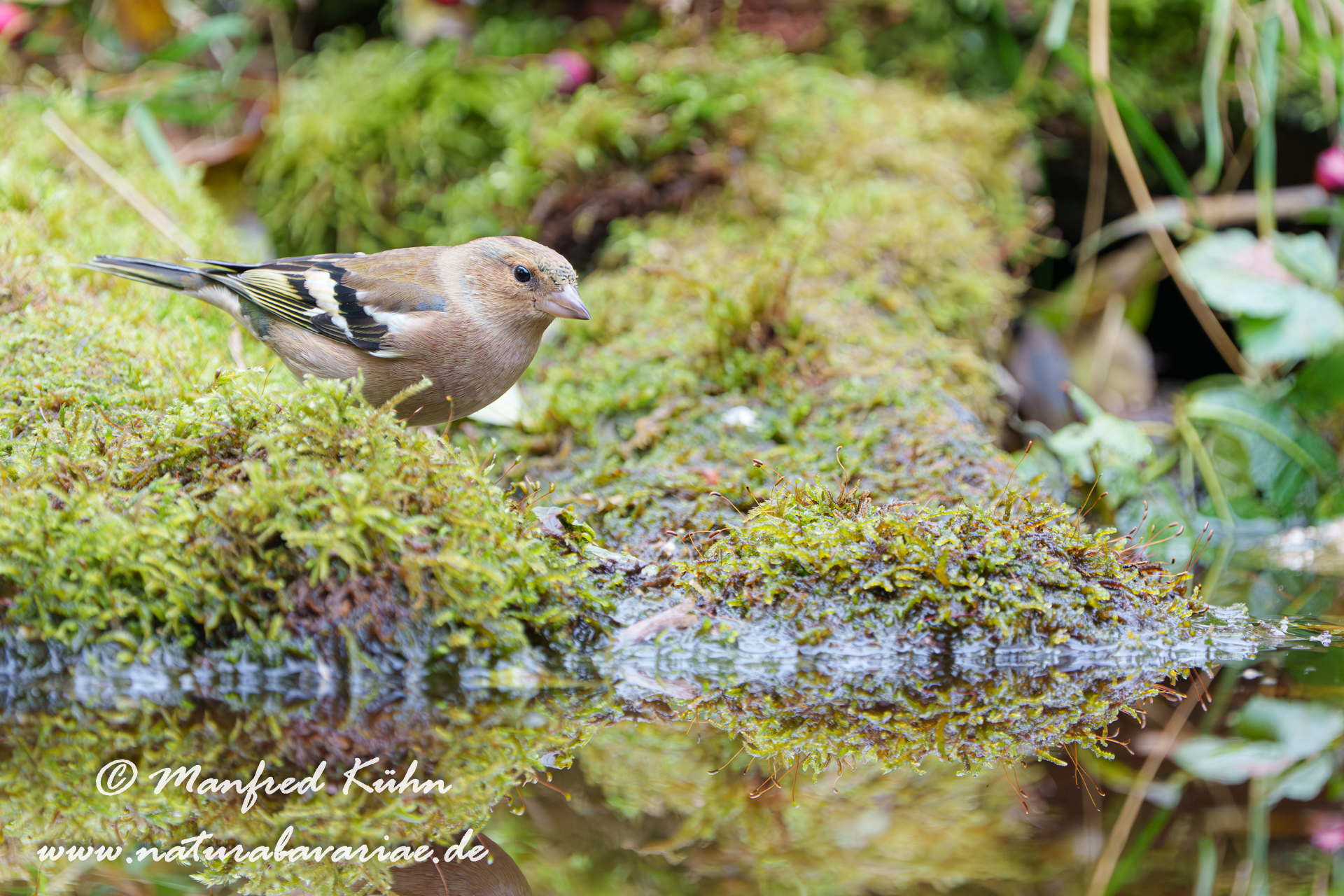 The common chaffinch (Fringilla coelebs), usually known simply as the chaffinch, is a common and widespread small passerine bird in the finch family, female, Bavaria |Der Buchfink (Fringilla coelebs) ist ein zur Familie der Finken (Fringillidae) gehöriger Singvogel, Weibchen, Bayern,