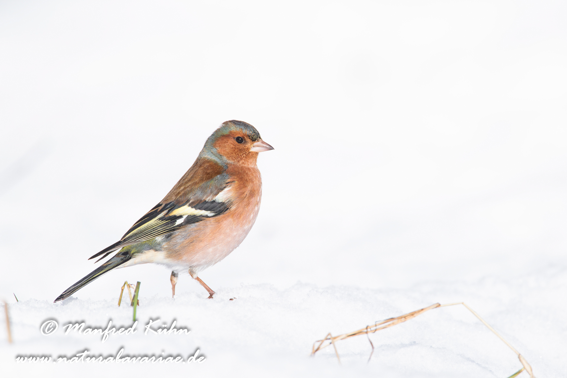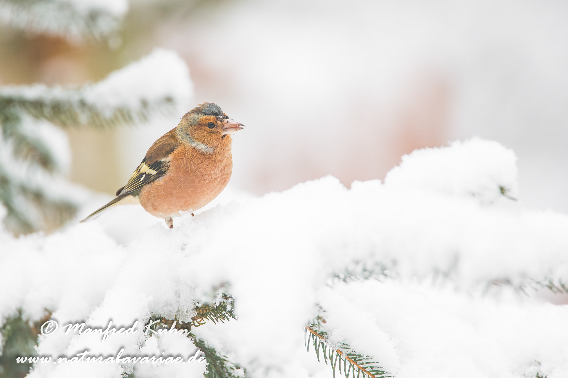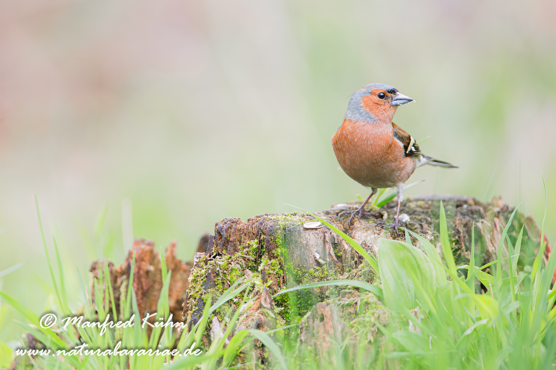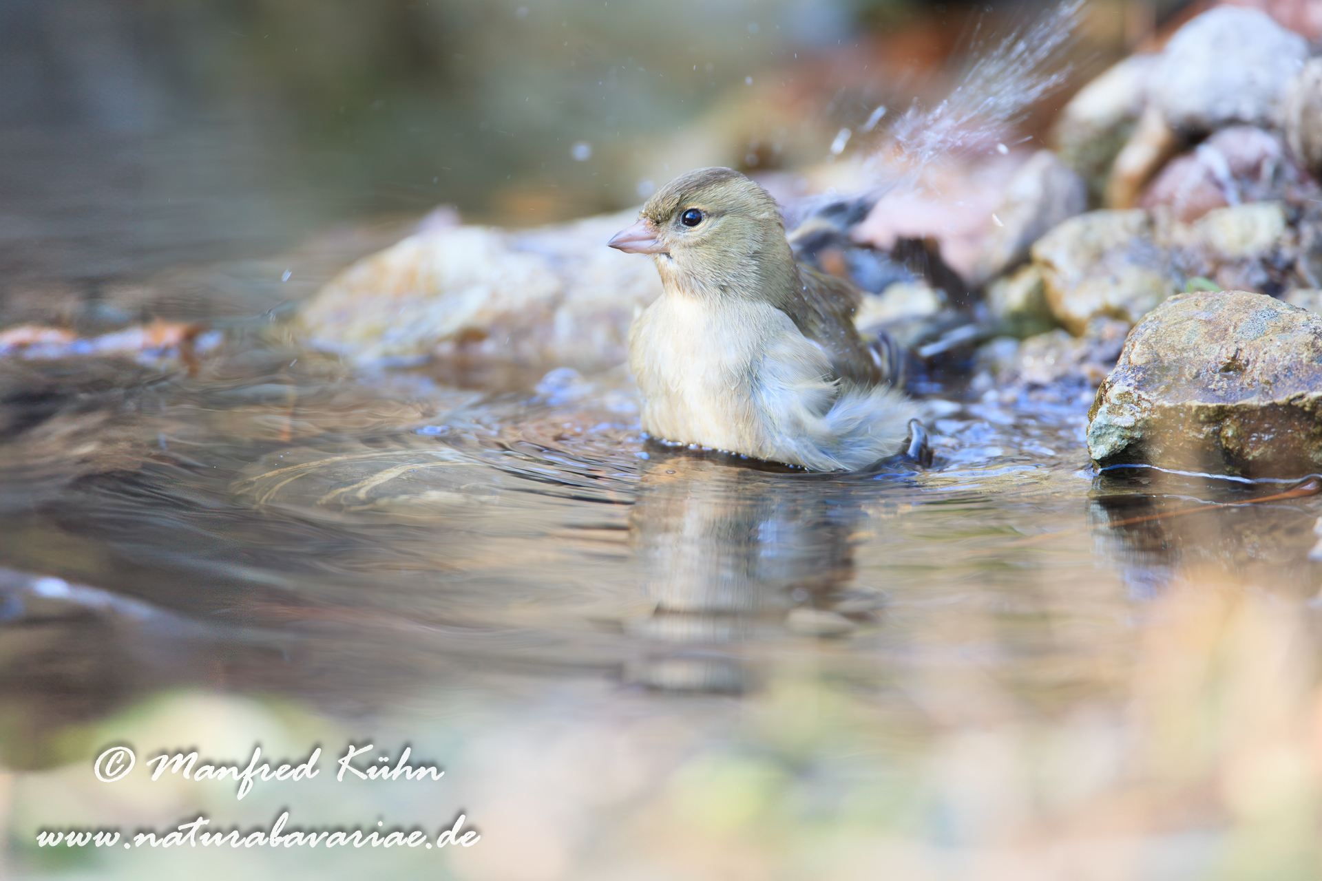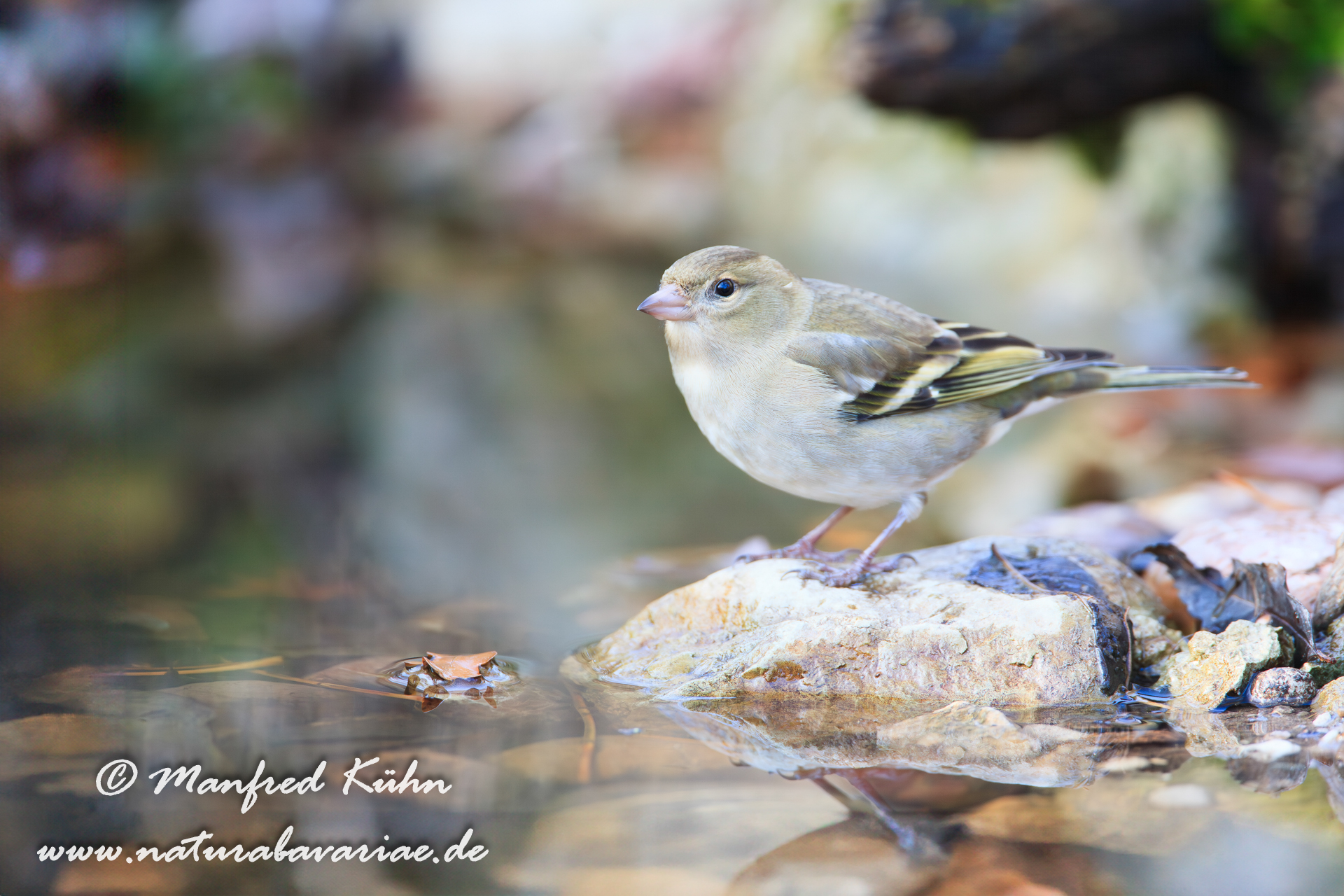 The common chaffinch (Fringilla coelebs), usually known simply as the chaffinch, is a common and widespread small passerine bird in the finch family, female, Bavaria |Der Buchfink (Fringilla coelebs) ist ein zur Familie der Finken (Fringillidae) gehöriger Singvogel, Weibchen, Bayern,