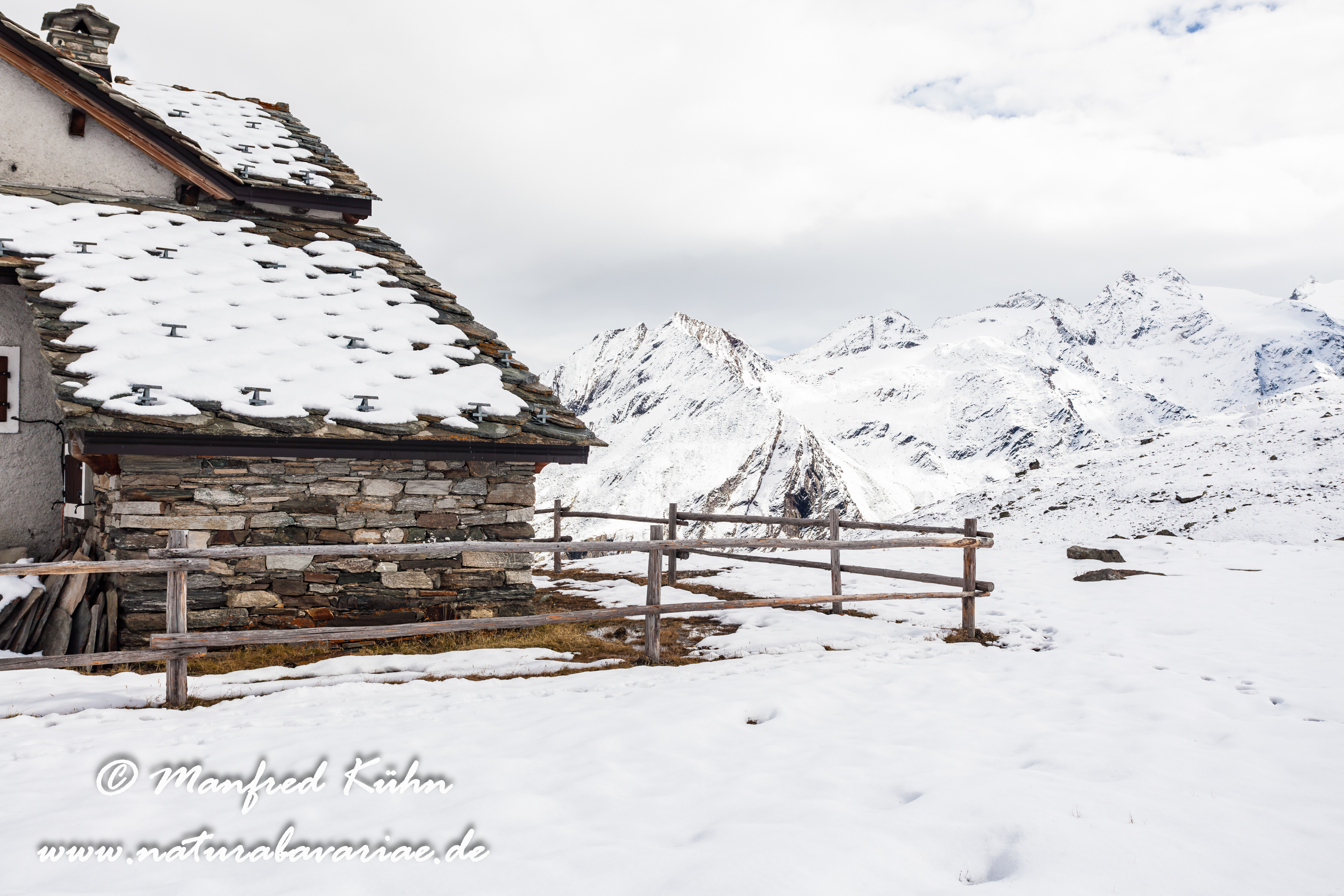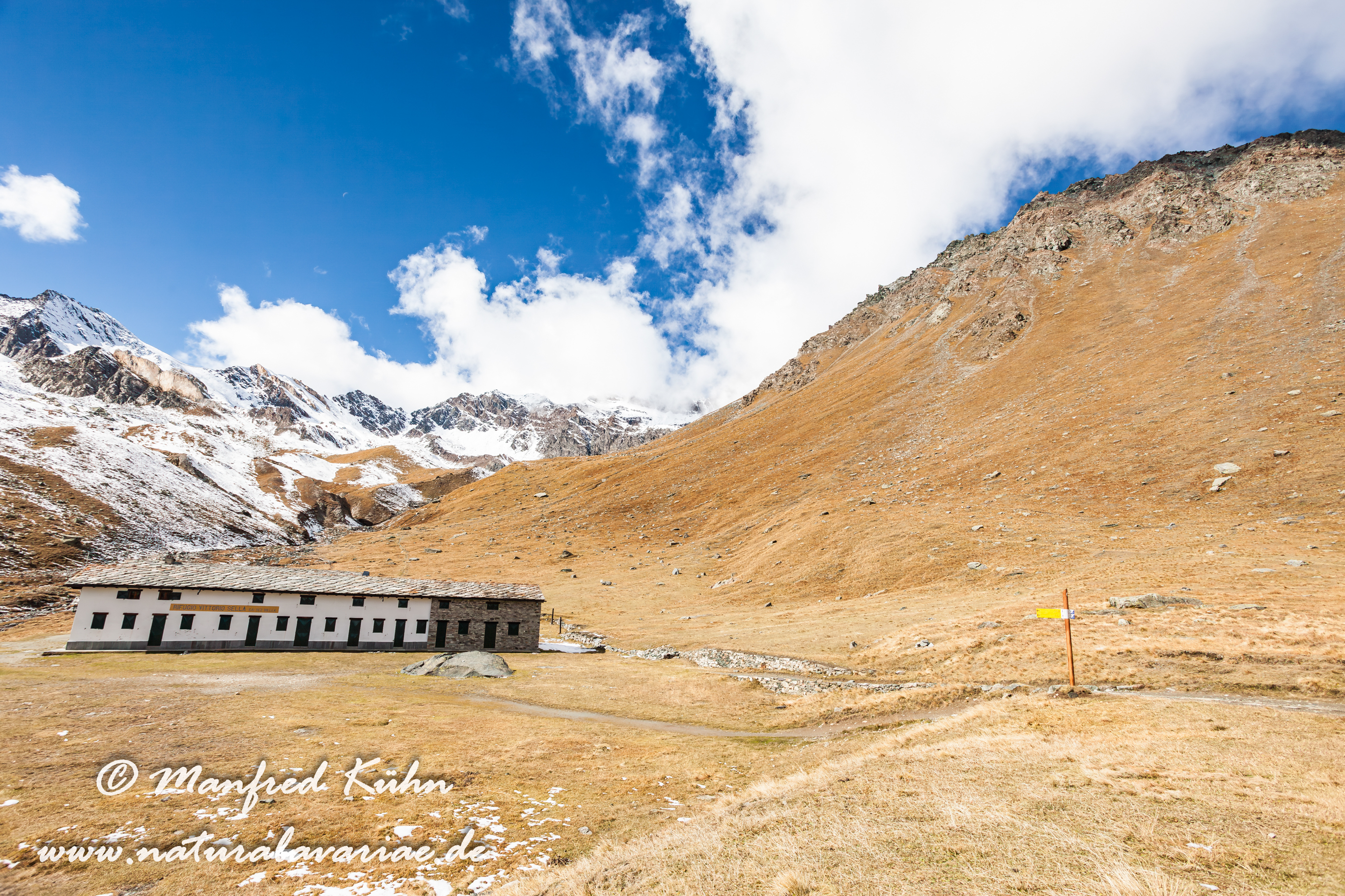 Sella alpine hut, Alpe Lauson high valley, mountain panorama, snow, Valley of Valnontey, Region Aosta, Grand Paradiso National Park, North Italy |Refugio Sella, Schnee, Alpe Lauson Hochtal, Valnontey Tal, Region Aosta, Norditalien